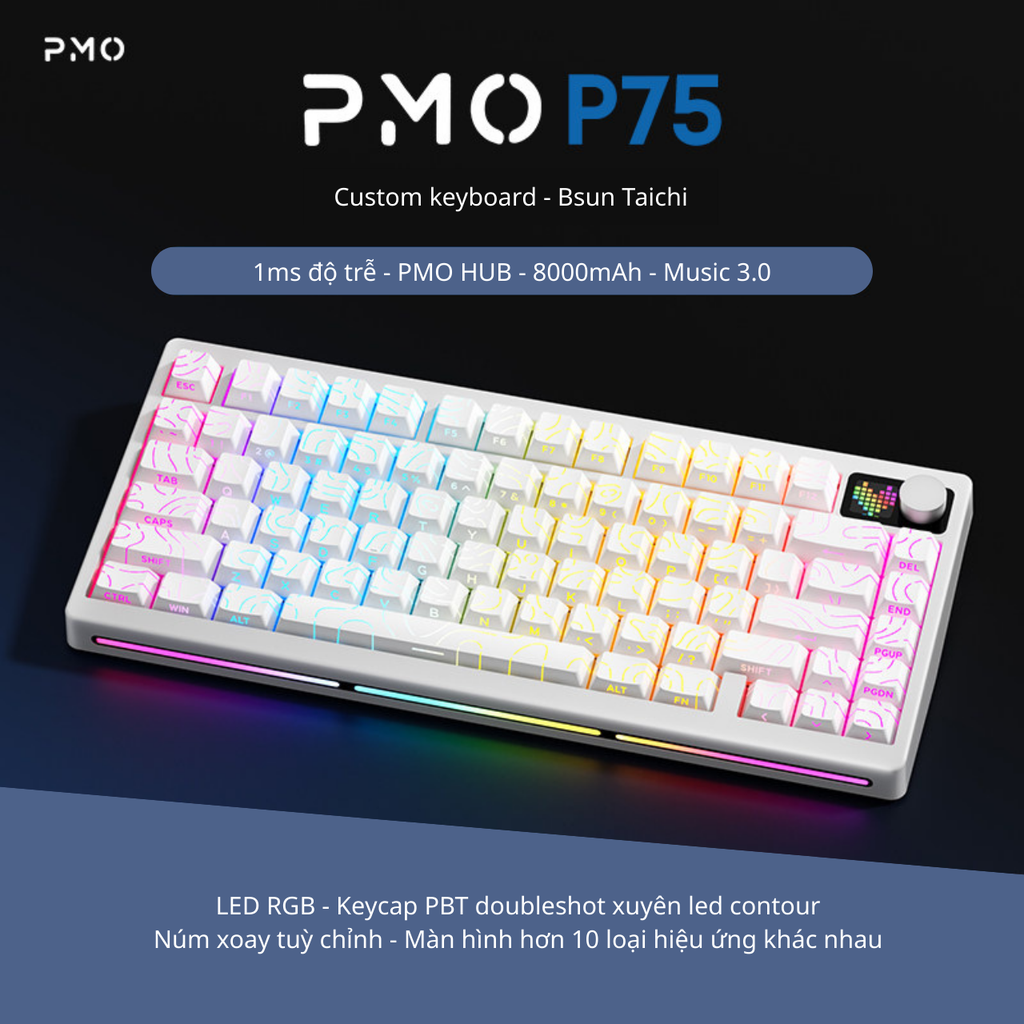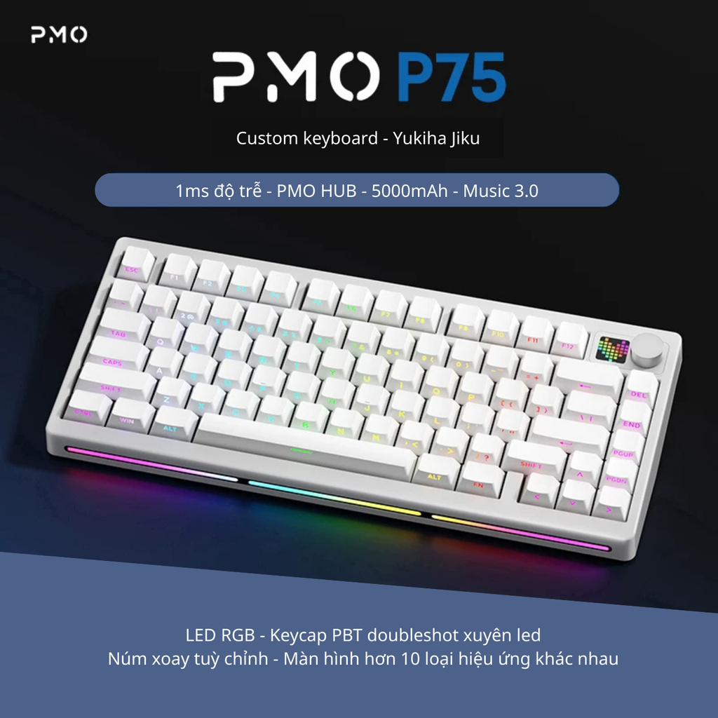 PMO P75 là mẫu bàn phím cơ layout 75% thế hệ mới, nổi bật với thiết kế đậm chất gaming – cyberpunk, trang bị núm xoay kim loại CNC, màn hình LED dot-matrix độ phân giải cao, cùng hệ thống RGB đa tầng cực kỳ bắt mắt. Đây là lựa chọn lý tưởng cho cả người chơi phím cơ, game thủ lẫn dân setup góc máy đẹp.