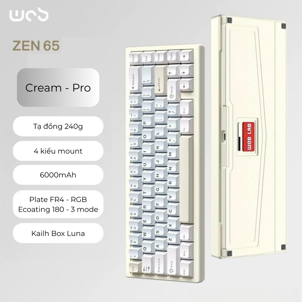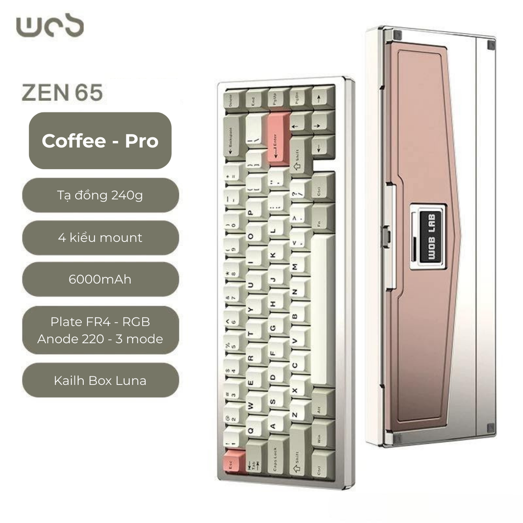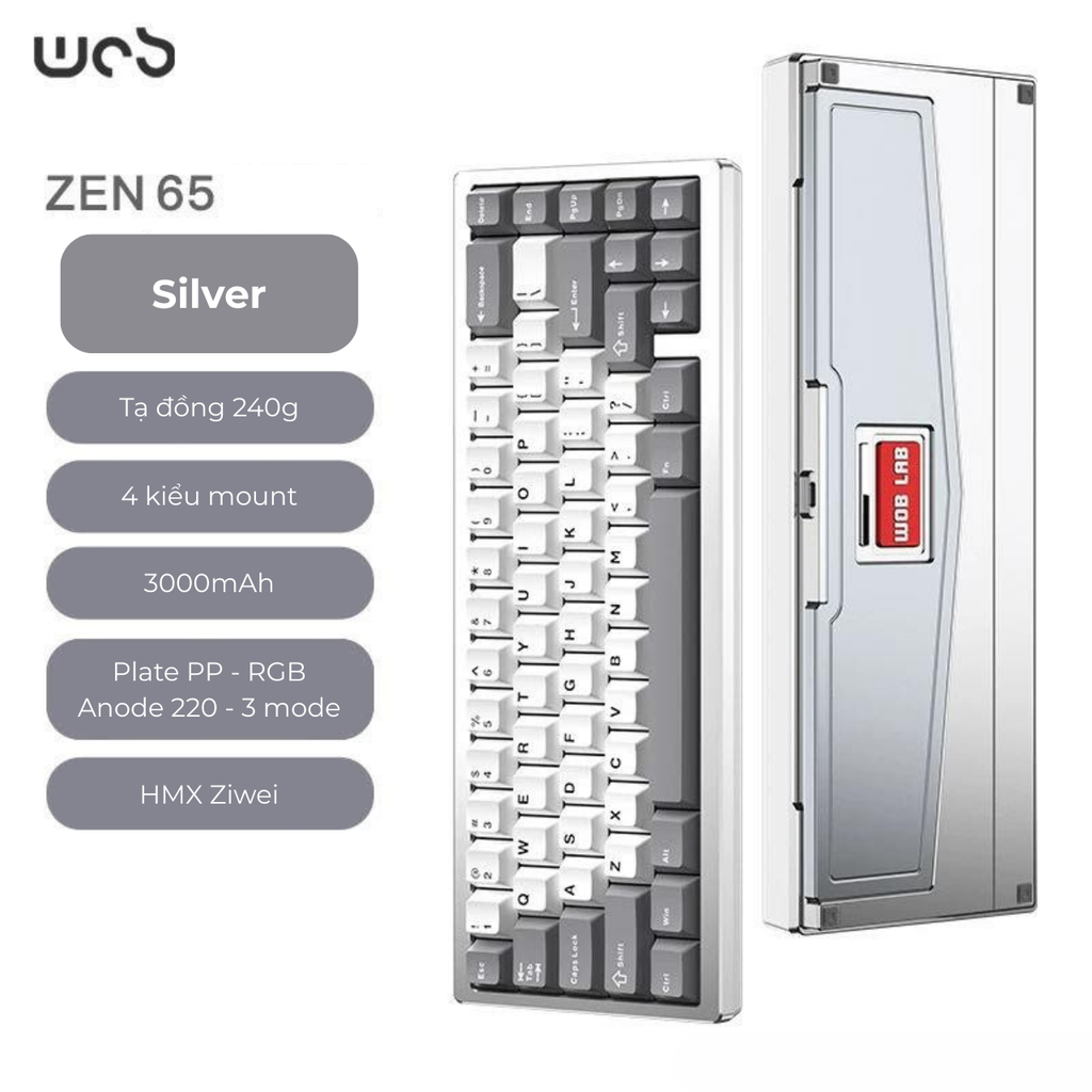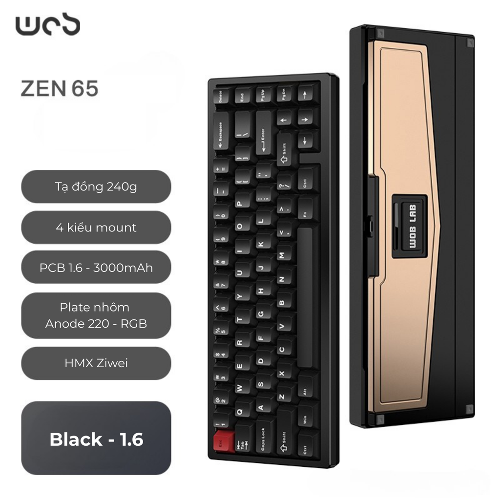 WOB ZEN65 là bàn phím cơ custom cao cấp thuộc phân khúc 65% layout, được thiết kế với triết lý “đơn giản nhưng tinh tế”, mang lại trải nghiệm gõ mượt mà, âm thanh trong trẻo cùng khả năng tùy biến mạnh mẽ. Với trọng lượng khung đồng thau 240g, pin dung lượng 3000mAh và nhiều công nghệ hiện đại, ZEN65 xứng đáng là lựa chọn hàng đầu cho những ai yêu thích sự cao cấp trong từng cú gõ.