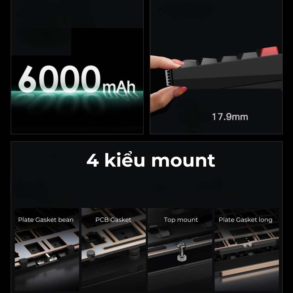 - Cấu trúc gasket mount với nhiều lớp đệm: cho cảm giác gõ êm ái, hạn chế cộng hưởng.